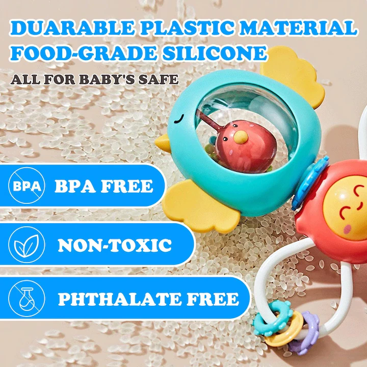 - Design Atractiv: Jucăria are forma unei păsări cu aripi și accesorii rotative, toate colorate în nuanțe vibrante pentru a capta atenția copilului.